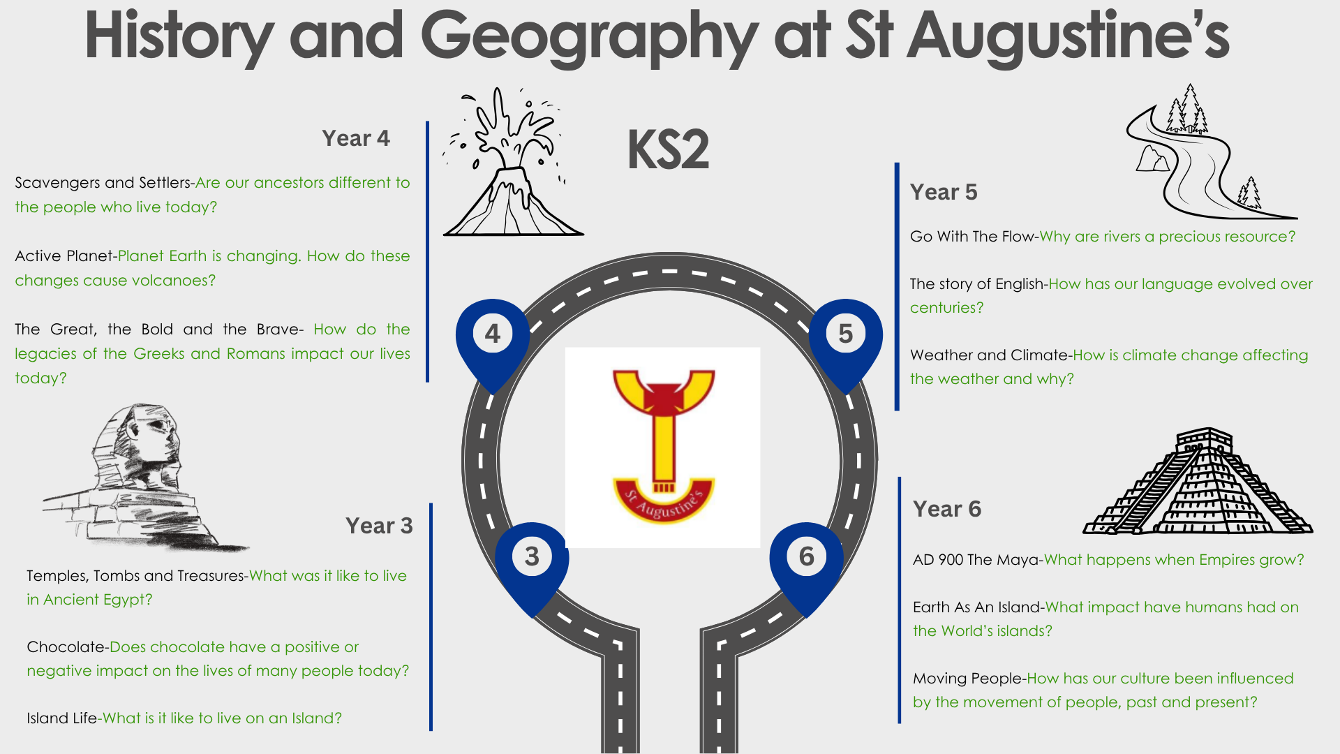 At St. Augustine’s we aim to inspire a sense of curiosity and understanding about our local area, Britain, the world, and its people. Geography provides children with the opportunity to learn about the world we live in and appreciate the world on both a local and a global scale as they explore human and physical geography. By looking at and comparing the physical, human, economic and environmental issues and features affecting each area of the world, children can begin to understand how the choices they make have an impact on others around them. We aim to make meaningful links between geography and other subjects to ensure a cross curricular approach to learning. Children will also have the opportunity observe and collect data about people, cultures, and natural environments through fieldwork, to deepen their understanding of the world we live in. We aim to make meaningful links between geography and other subjects to ensure a cross curricular approach to learning.